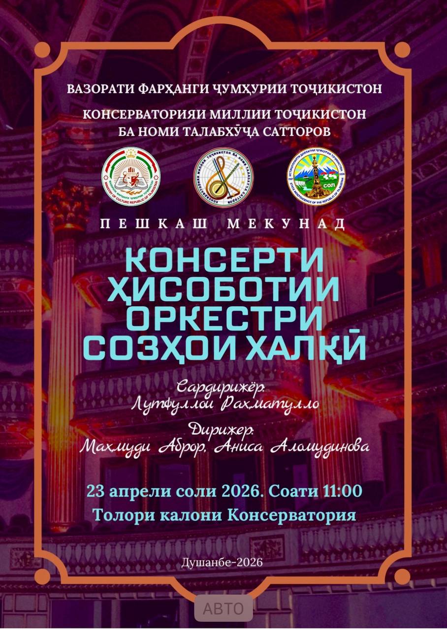 Санаи 23.04.2026, соати 10:00 дар Толори калони Консерваторияи миллии Тоҷикистон ба номи Талабхӯҷа Сатторов ба истиқболи 35-солагии Истиқлоли давлатии Ҷумҳурии Тоҷикистон консерти ҳисоботии оркестри созҳои халқӣ баргузор мешавад.